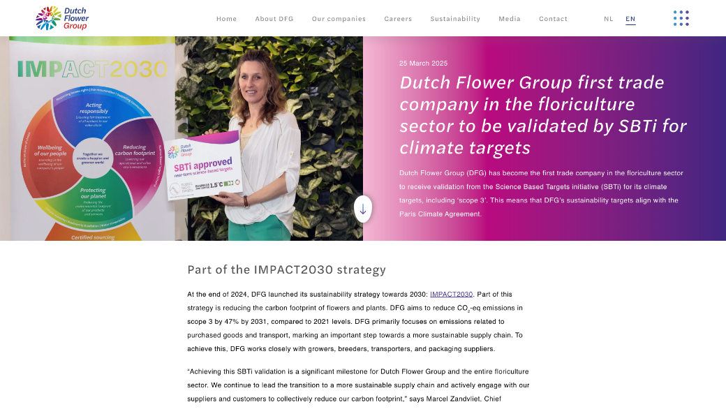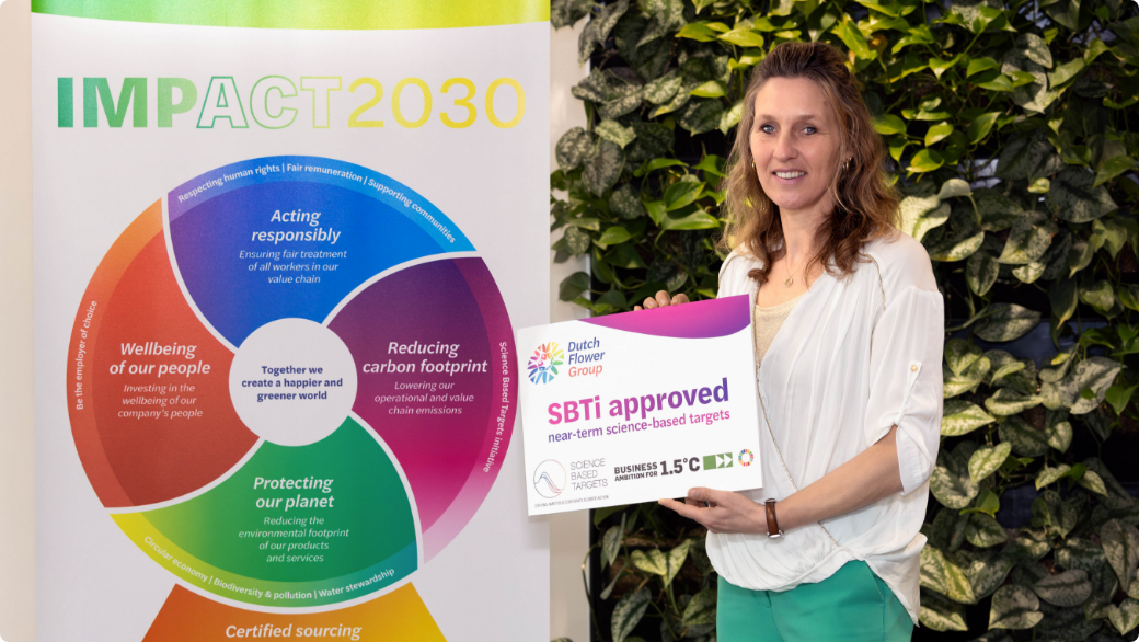 | Dear colleague, We as Dutch Flower Group have become the first trade company in the floriculture sector to receive validation from the Science Based Targets initiative (SBTi) for its climate targets, including ‘scope 3’. Thanks to all the efforts of our DFG Sustainability Team in the past years, our climate targets are now validated by the SBTi. If you want to know more about what this means and what our mutual next steps are, please continue reading this newsletter. |